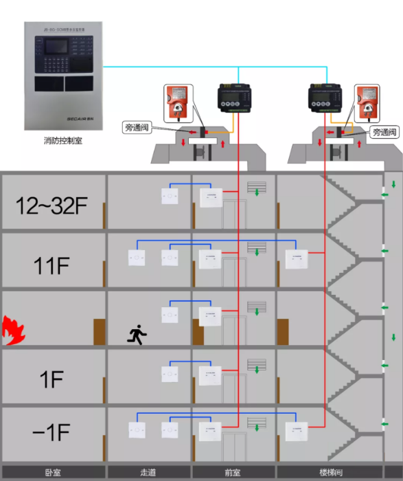 其中,余壓監控器安裝在消控室內,余壓探測器安裝在電梯前室和樓梯走道,余壓控制器和風閥控制器安裝在風機控制柜。